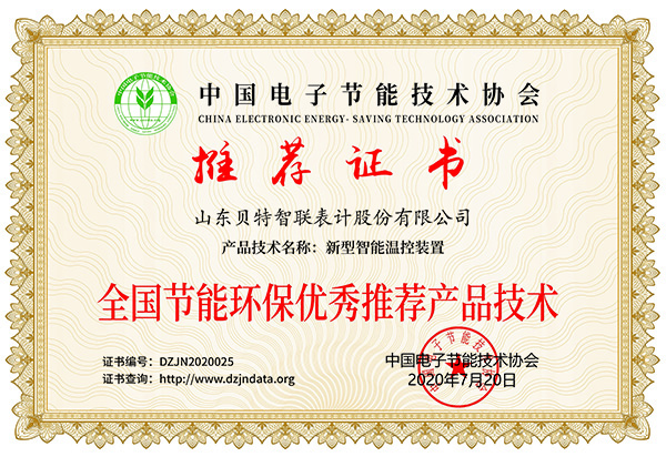 智能溫控裝置節(jié)能環(huán)保產(chǎn)品推薦證書